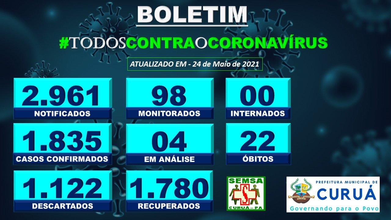 São 1.835 casos confirmados da COVID-19 (sendo 1.780 pacientes recuperados, 22 óbitos, 98 pacientes em monitoramento e 00 paciente hospitalizado, 04 em análise, 1.122 descartados, 2.961 notificados).Informações repassadas pela secretaria de saúde. Todos os protocolos do ministério da saúde estão sendo seguidos.INFORMAÇÕES ATUALIZADAS EM 24/05/2021. Todos contra o Coronavírus.